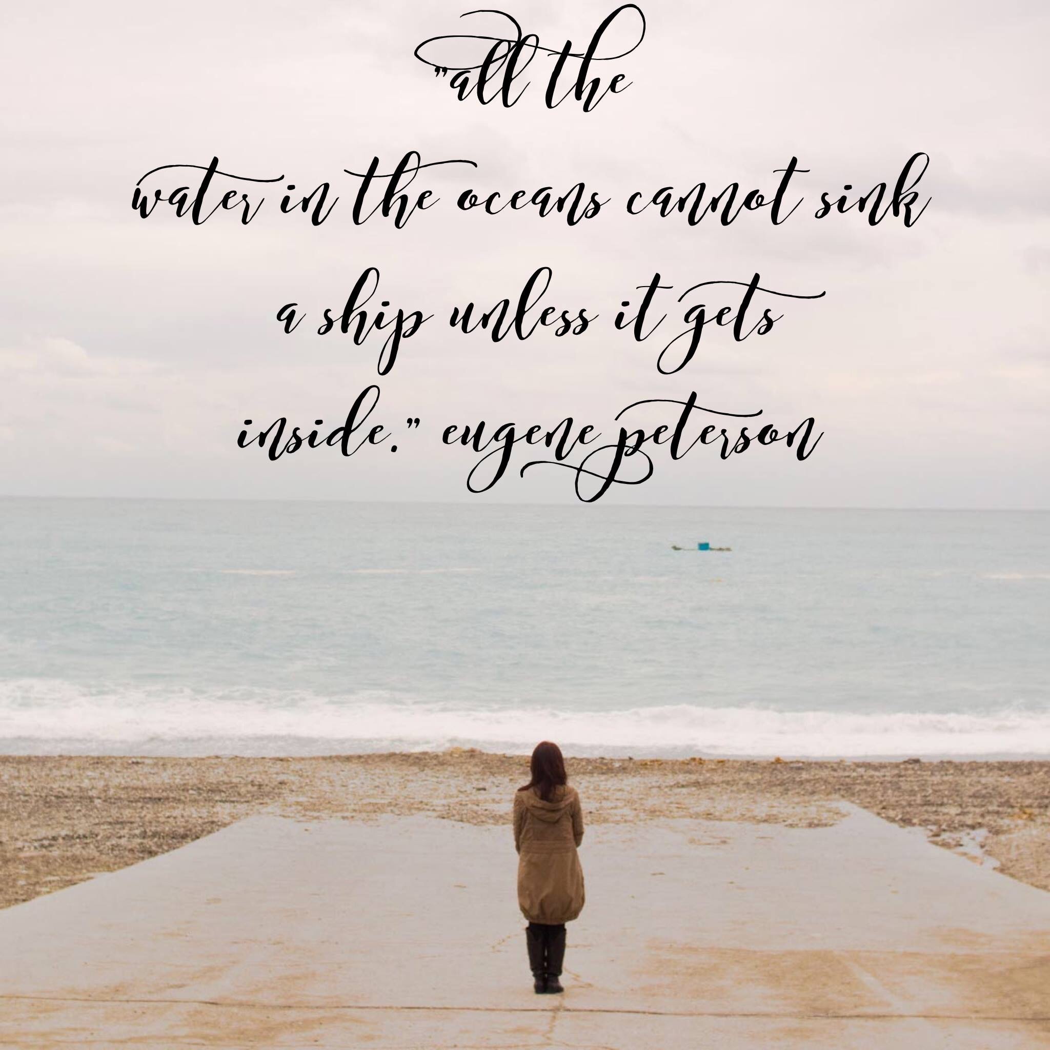 The Eugene Peterson quote above is the shortened version. The full quote reads: “All the water in the oceans cannot sink a ship unless it gets inside. Nor can all the trouble in the world harm us unless it gets within us.”. He uses the beautiful metaphor of the ocean to represent what life may throw at us. The truth is, water is powerful, persistent, and unyielding. Oceans can be calm or wild, gentle or stormy – yet ships can sail on through it all. Ships get battered by the winds and the rain, tossed around by the waves – yet the only thing that will sink them is if the water gets inside.